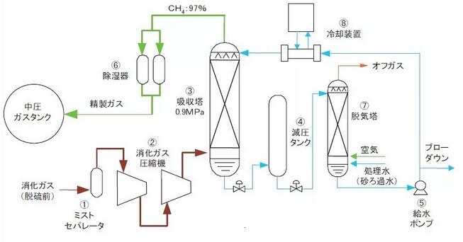 消化氣體在在0.9Mpa左右的中壓環(huán)境下和循環(huán)水接觸,消化氣體中硫化氫被水吸收,形成純度97%以上的甲烷氣體,可作為城市天然氣使用。該項(xiàng)技術(shù)在神戶和上田等地已經(jīng)建設(shè)投入使用。